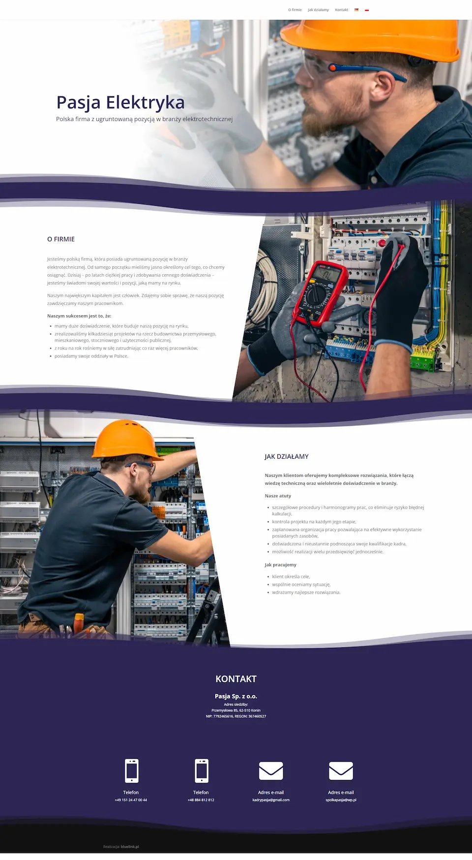 Dla firmy elektrotechnicznej z Konina mieliśmy przyjemność wykonać prostą wizytówkę w układzie One Page w dwóch wersjach językowych – polskiej i niemieckiej. Firma posiada ugruntowaną pozycję w branży elektrotechnicznej, którą potwierdza kilkadziesiąt zrealizowanych projektów na rzecz budownictwa przemysłowego, mieszkaniowego, stoczniowego i użyteczności publicznej,